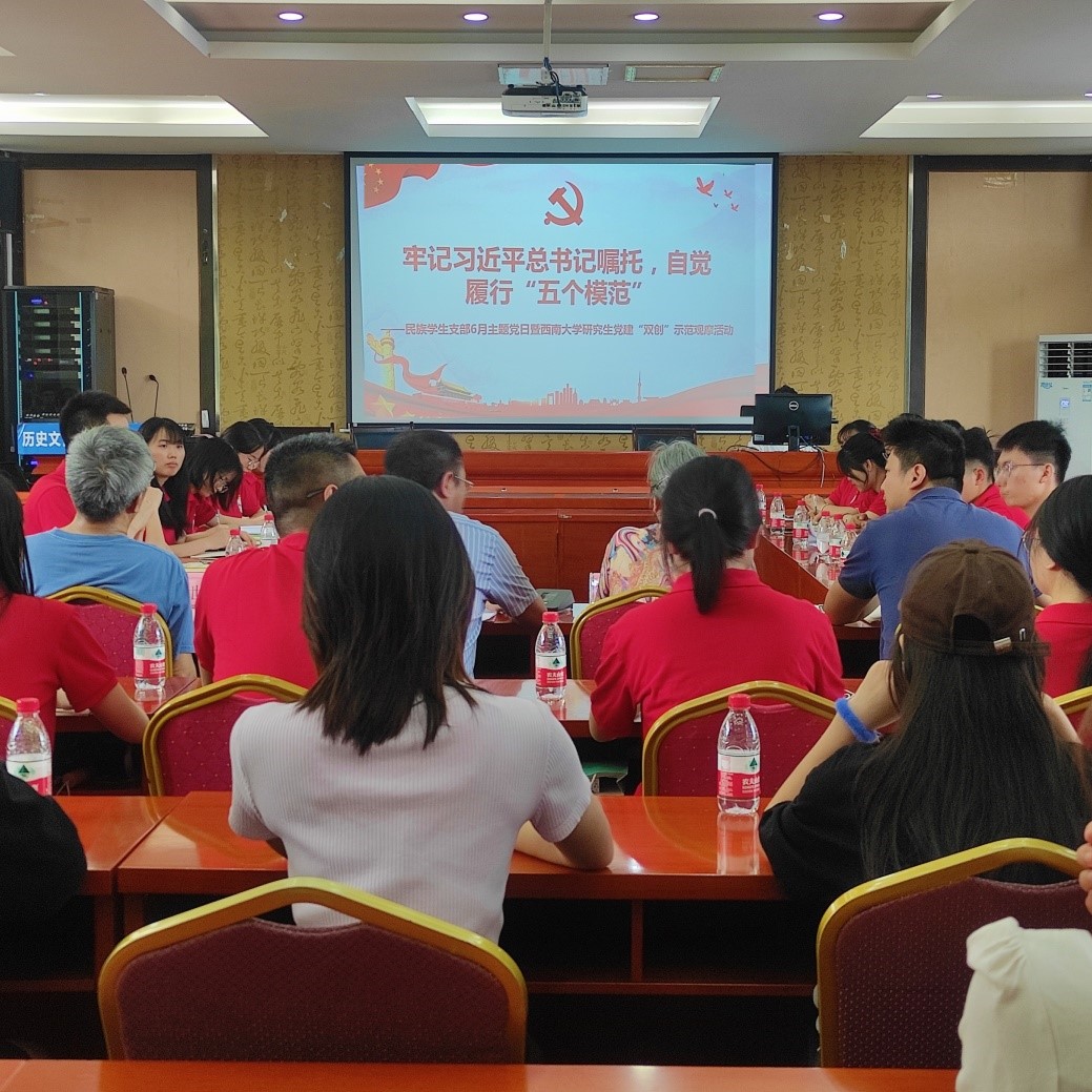 为铸牢中华民族共同体意识,进一步加强学校研究生党建“双创”工作,发挥样板党支部的示范引领作用,2022年6月17日下午,民族学生支部承办学校研究生党建“双创”示范观摩活动,党委研究生工作部组织全校26个研究生样板党支部支委参加观摩。历史文化学院党委书记罗庆昌、党委研究生工作部教育科科长胥宏祥、民族学生支部全体成员及各研究生样板党支部代表参与本次活动。观摩活动由民族学生支部书记庄伟主持。