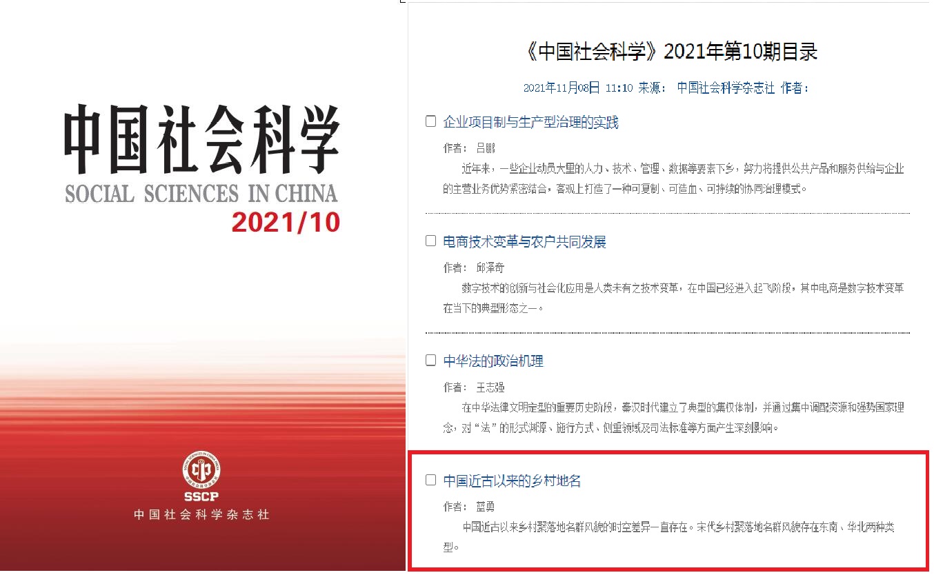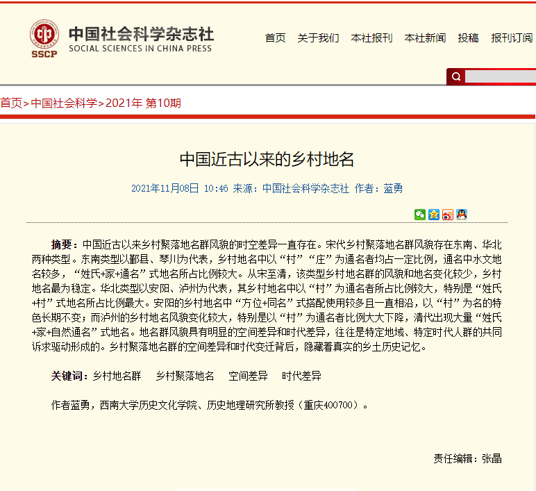近日,历史文化学院 bat365在线官网登录、历史地理研究所蓝勇教授《中国近古以来的乡村地名》一文在《中国社会科学》2021年第10期发表。该文认为:中国近古以来乡村聚落地名群风貌的时空差异一直存在。宋代乡村聚落地名群风貌存在东南、华北两种类型。东南类型以鄞县、琴川为代表,乡村地名中以“村”“庄”为通名者均占一定比例,通名中水文地名较多,“姓氏+家+通名”式地名所占比例较大。从宋至清,该类型乡村地名群的风貌和地名变化较少,乡村地名最为稳定。华北类型以安阳、泸州为代表,其乡村地名中以“村”为通名者所占比例较大,特别是“姓氏+村”式地名所占比例最大。安阳的乡村地名中“方位+同名”式搭配使用较多且一直相沿,以“村”为名的特色长期不变;而泸州的乡村地名风貌变化较大,特别是以“村”为通名者比例大大下降,清代出现大量“姓氏+家+自然通名”式地名。地名群风貌具有明显的空间差异和时代差异,往往是特定地域、特定时代人群的共同诉求驱动形成的。乡村聚落地名群的空间差异和时代变迁背后,隐藏着真实的乡土历史记忆。