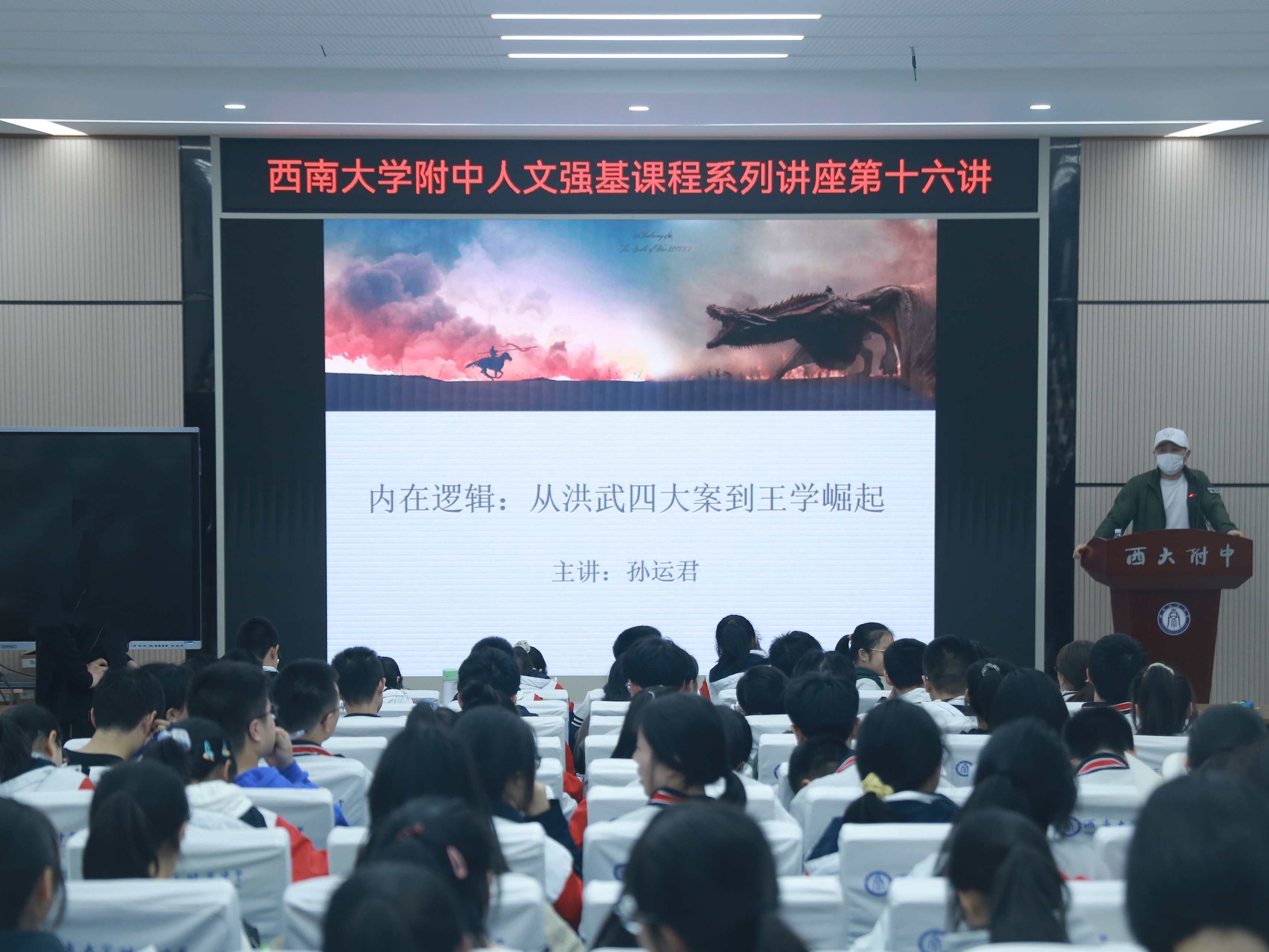 10月15日晚上7点,“西南大学附中人文强基课程系列讲座”新学期第16讲在西南大学附中万象楼阶梯教室准时开始,本次讲座的嘉宾老师为西南大学历史文化学院孙运君副教授,西南大学附中马彬琼老师担任讲座主持人。