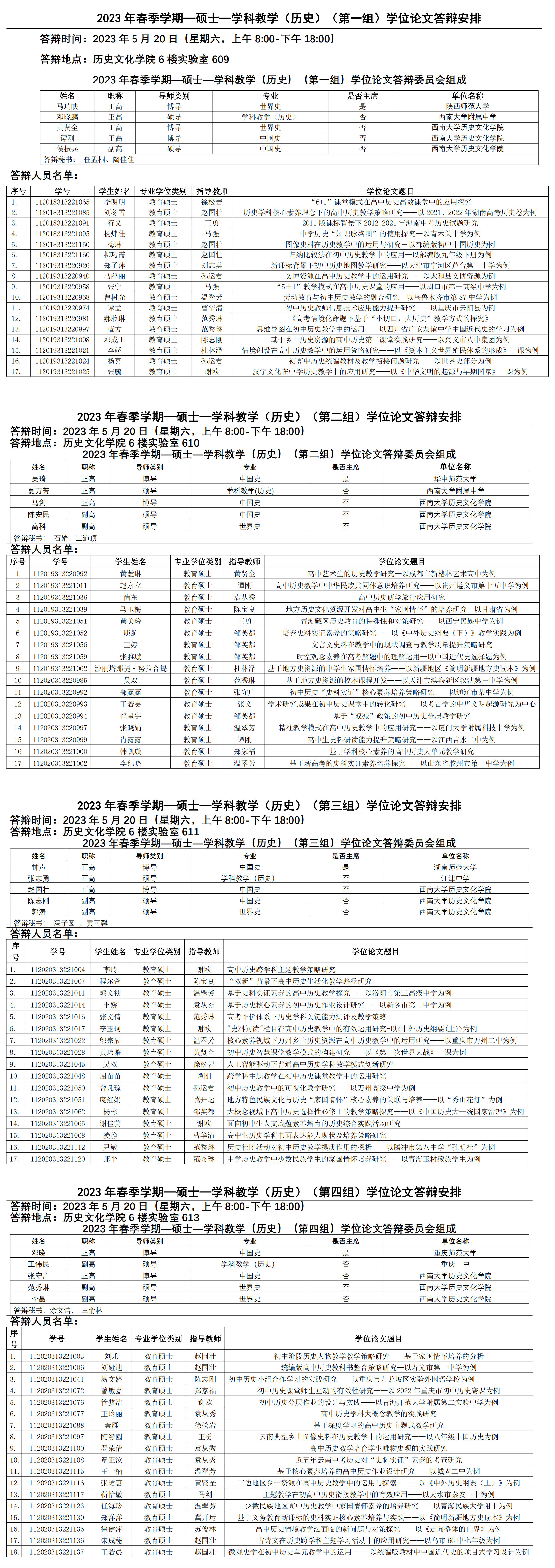 2023年春季学期硕士研究生—学科教学(历史)学位论文答辩安排